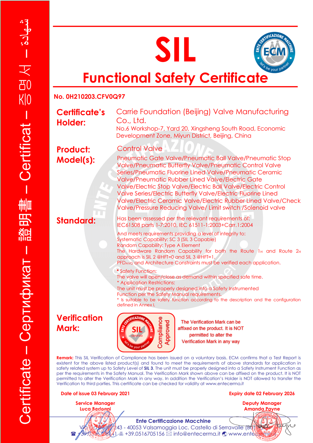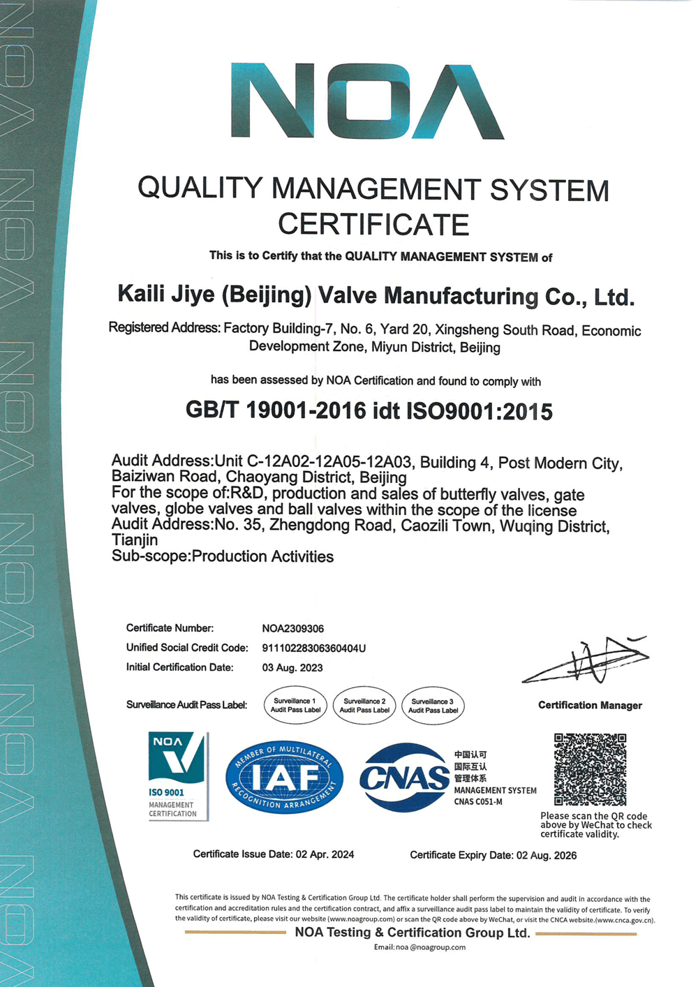 NOA-Quality Management System Certificate