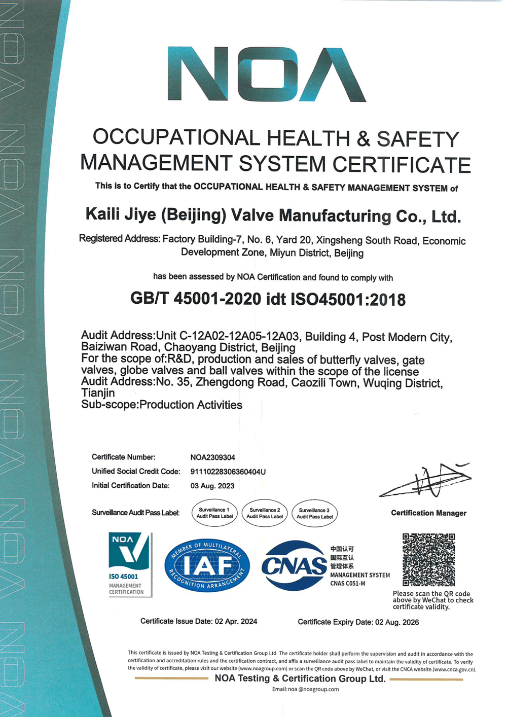 NOA-Occupational Health & Safety Management System Certificate